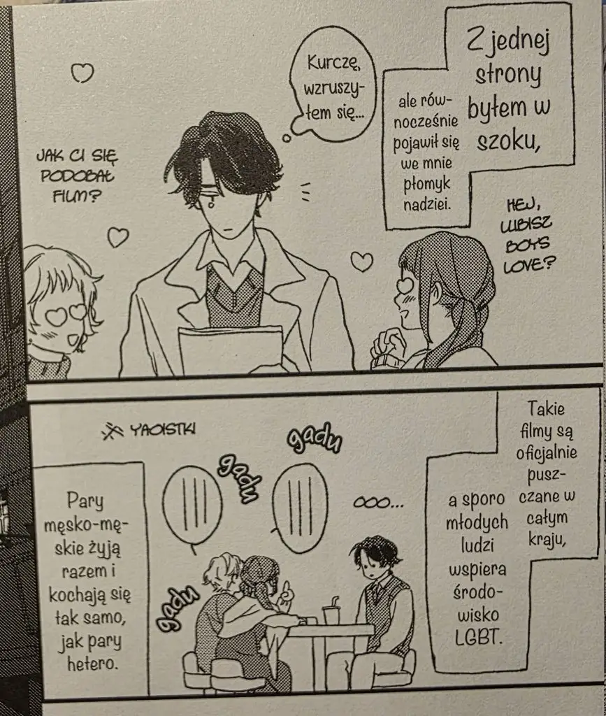 As usual, Minta Suzumaru doesn’t disappoint from an artistic point of view: you can expect a BL feast for your eyes. If you read any of her manga before, you know what to expect. From a lighthearted standpoint, there were a few comedic scenes that made me cackle, and I enjoyed the depiction of Yoshino discovering his sexuality through BL media, which had become normalised enough to be shown in theatres. That was very sweet, and I bet many queer guys had some double-thoughts when peeking at BL media from afar!